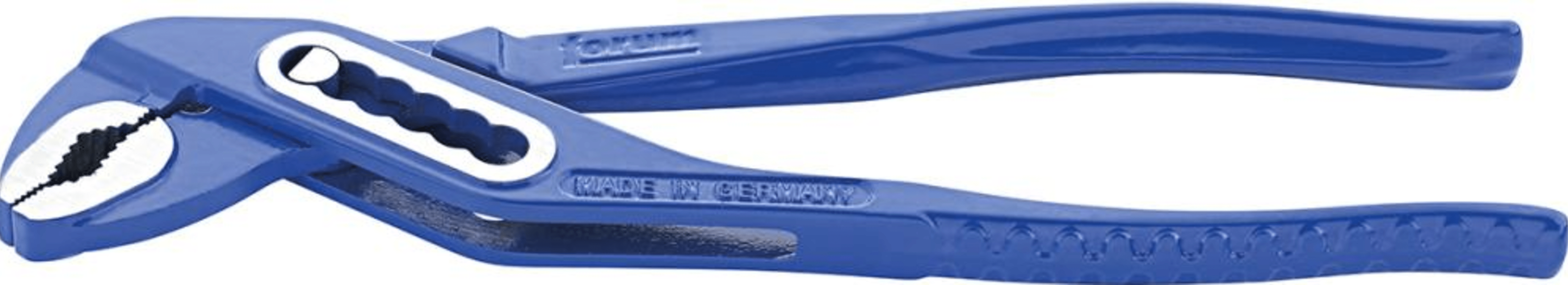 Wasserpumpenzange• Kopf und Griffe lackiert • Chrom-Vanadium-Stahl, hochwertig vergütet • Maul und Gelenk geschliffen • Klemmschutz verhindert Quetschverletzungen • Selbstklemmend an Rohren und Mu
