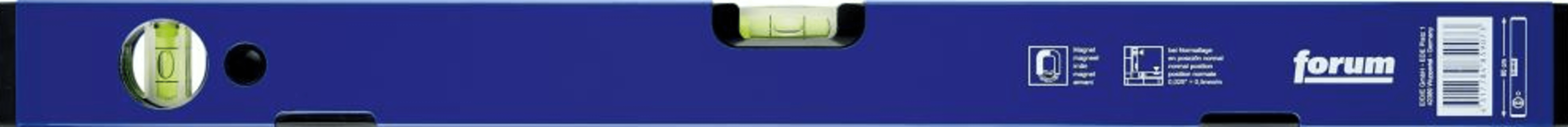 FORUM LM-Magnet-WasserwaageMit Magnetstreifen. Starkes Rechteckprofil mit glatten Seitenflächen, aus besonders korrosionsbeständiger Leichtmetall-Legierung. Schlagfeste Oberfläche mit blauer Pulverbeschichtung. Unzerbrechliche Libellen aus Block-Acrylglas.Messgenauigkeit in Normallage: 0,029° = 0,5 mm/m.