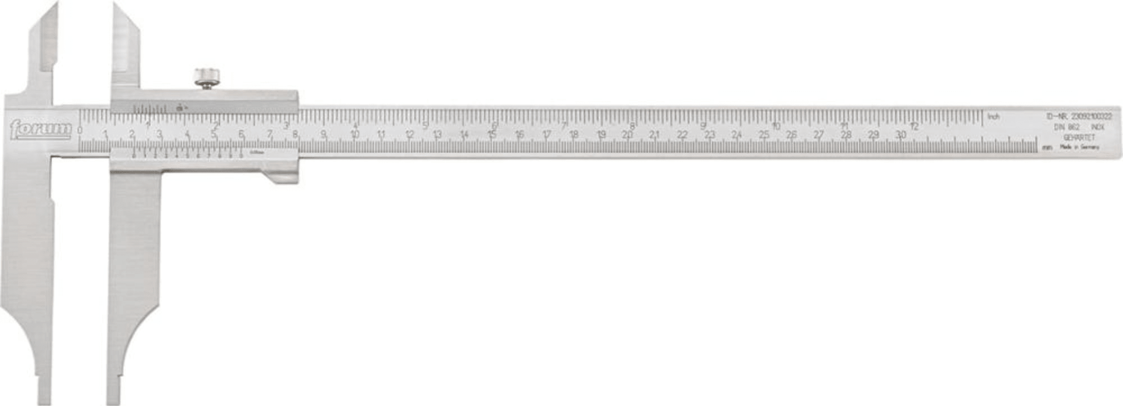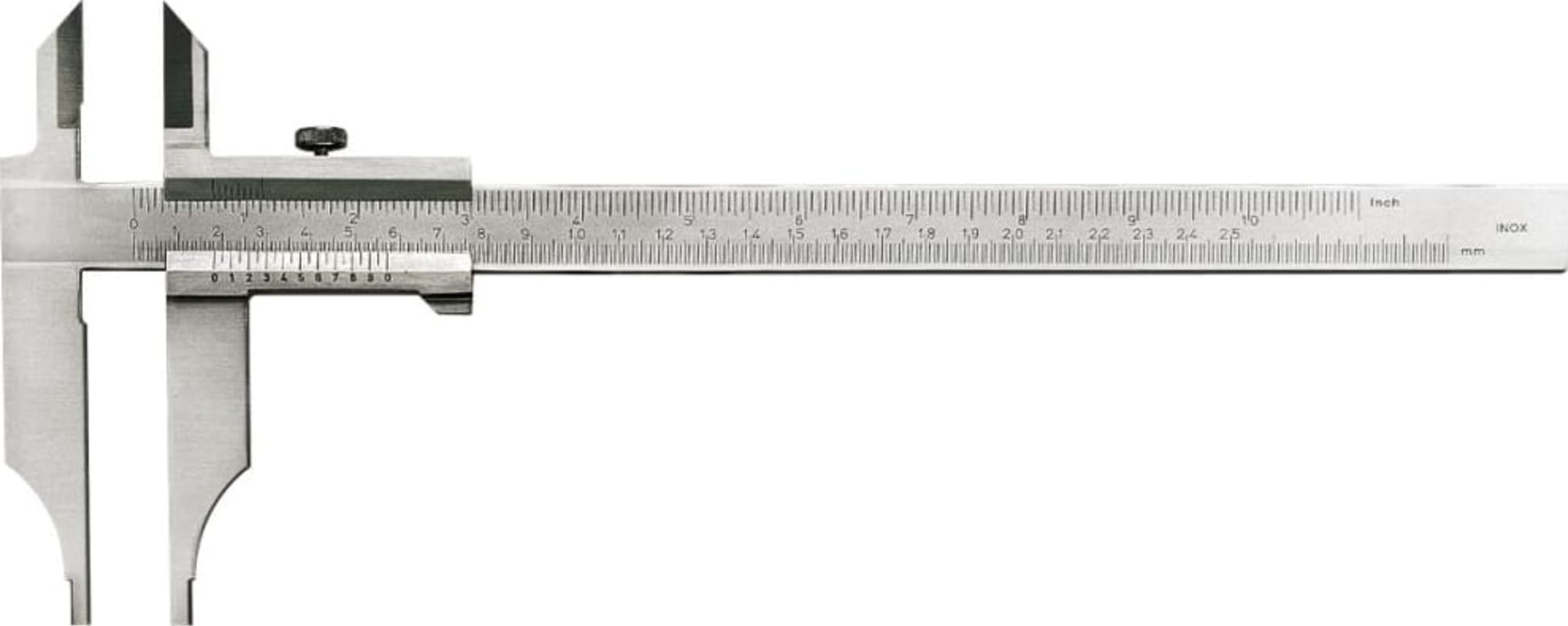 Werkstattmessschieber mit Messerspitzen, ohne Feineinstellung• DIN 862 • Stahl, rostfrei • Nonius und Skala matt verchromt • Hauptteilung gegen Abnutzung leicht vertieft liegend • Mit Feststellsch