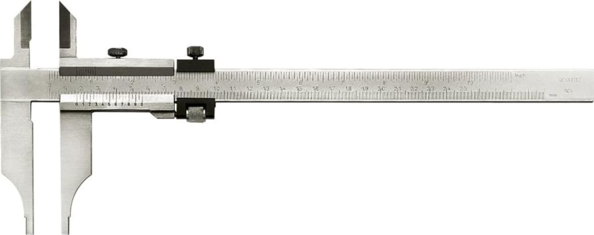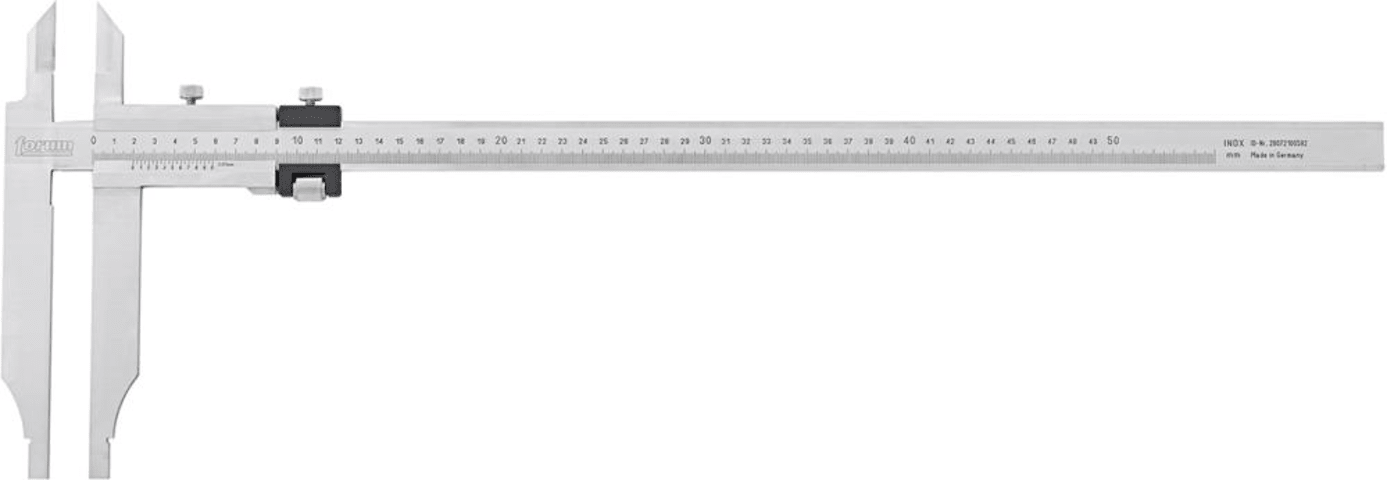 Werkstattmessschieber mit Messerspitzen und Feineinstellung• DIN 862 • Stahl, rostfrei • Nonius und Skala matt verchromt • Hauptteilung gegen Abnutzung leicht vertieft liegend • Mit Feststellschra