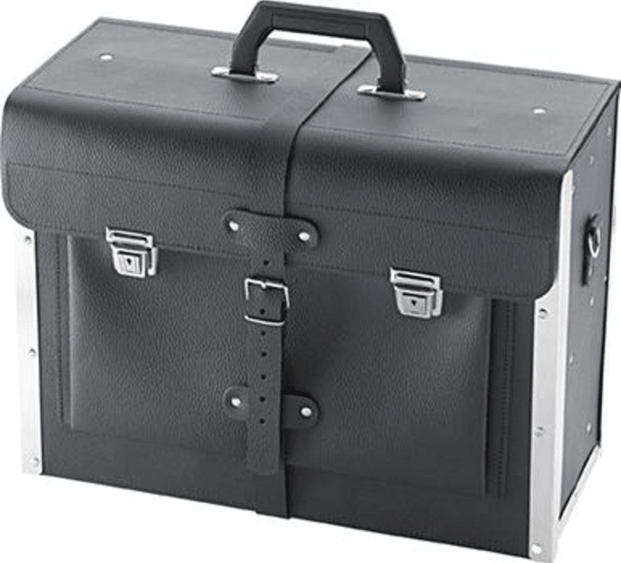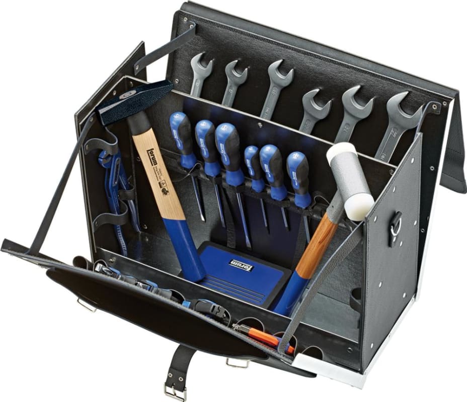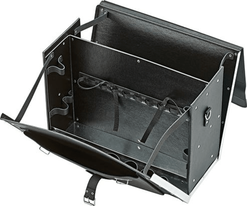 Werkzeugtasche• Leder • Bodenschale aus Stahlblech, verzinkt • Vorder- und Rückwand mit je 8 Einsteckfächern • Vorder- und Rückwand teilaufklappbar • Feststehende Mittelwand mit je 9 verstellbaren