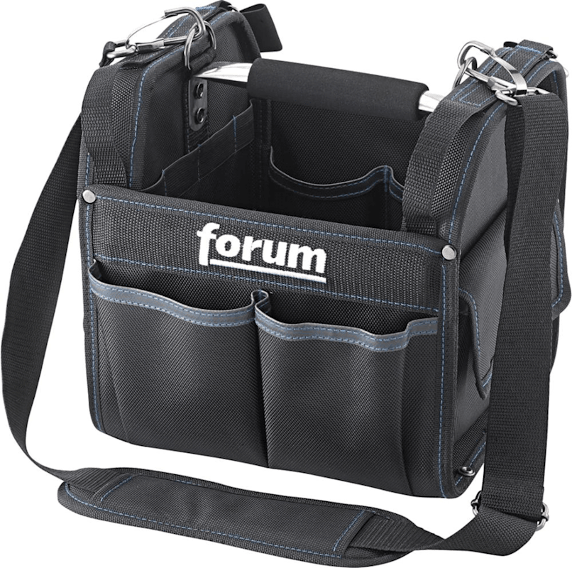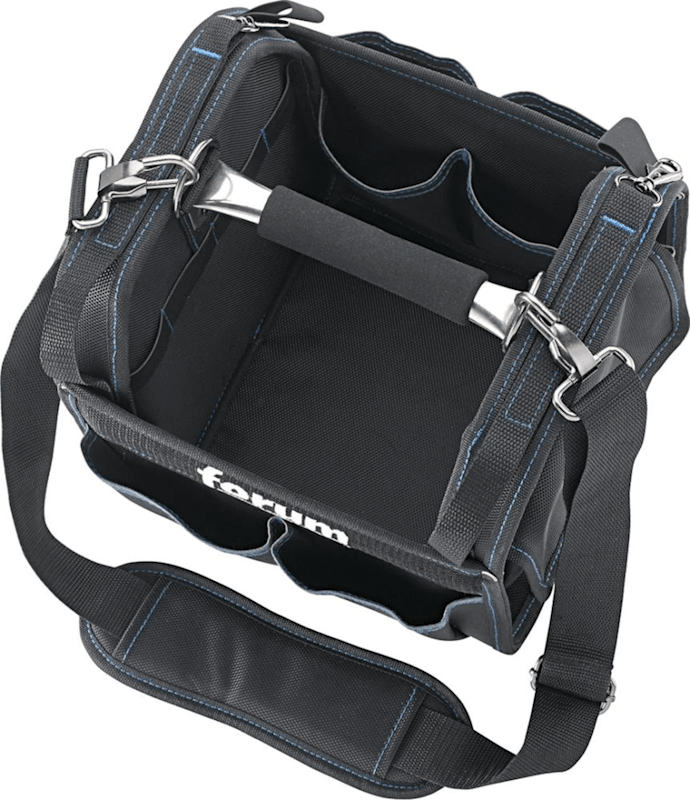 Werkzeugtasche, klein• Nylon 1680 Denier • Tragegriff gepolstert • Trageriemen gepolstert und längenverstellbar • Kunststoffbodengleiter • 2 große Außentaschen mit Klettverschluss • 4 Außenfächer
