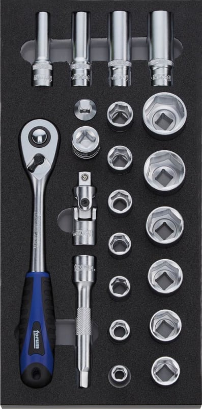 Werkzeugmodul Betätigungswerkzeuge 1/2", leer• 2-farbige Schaumstoffeinlage, fehlende Werkzeuge auf einen Blick erkennen Zur Aufnahme von: 1 Hebel-Umschaltknarre, 72 Zähne 13 6-kant-Steckschlüssel