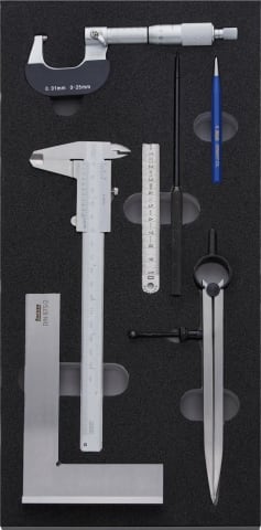 Werkzeugmodul Messtechnik, leer• 2-farbige Schaumstoffeinlage, fehlende Werkzeuge auf einen Blick erkennen Zur Aufnahme von: 1 Taschenmessschieber, rostfrei 150 mm 1 Stahlmaßstab, biegsam, rostfr