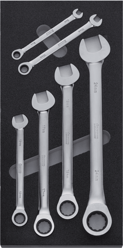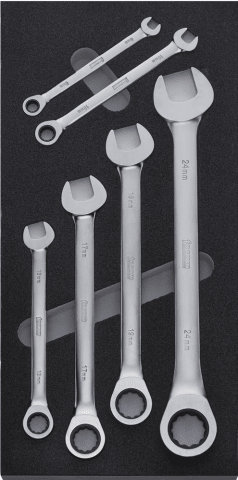 Werkzeugmodul Ratschenschlüssel, gerade• 2-farbige Schaumstoffeinlage, fehlende Werkzeuge auf einen Blick erkennen Inhalt: 6 Maulschlüssel mit Ringratsche 8; 10; 13; 17; 19; 24 mm