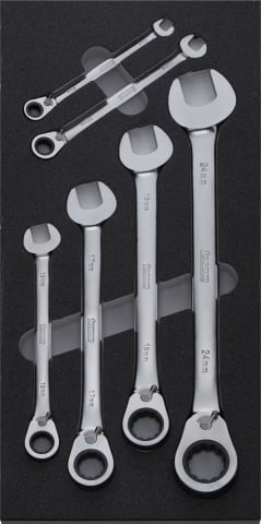 Werkzeugmodul Ratschenschlüssel, umschaltbar, leer• 2-farbige Schaumstoffeinlage, fehlende Werkzeuge auf einen Blick erkennen Zur Aufnahme von: 6 Maulschlüssel mit Ringratsche 8; 10; 13; 17; 19; 24