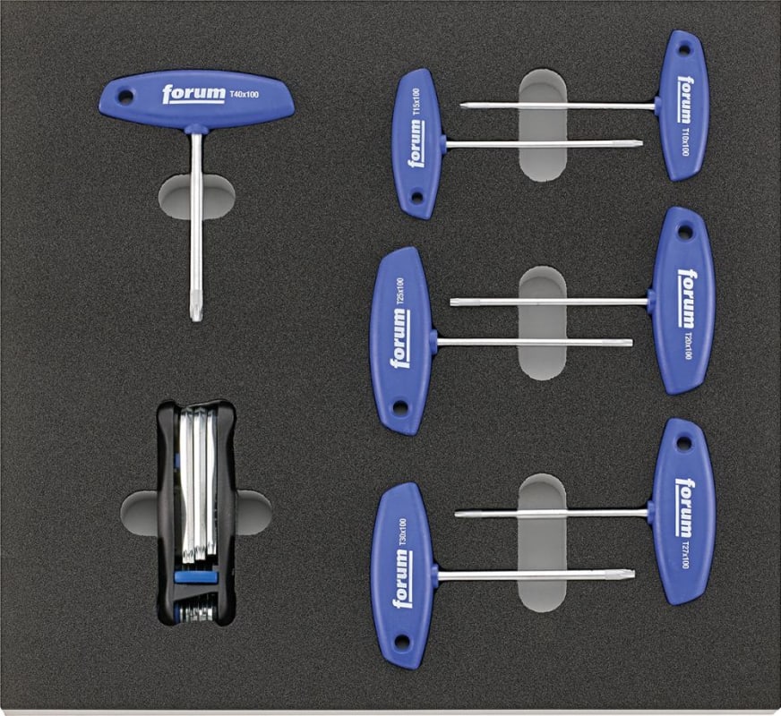 Werkzeugmodul Schraubendreher mit Quergriff für TORX®, leer• 2-farbige Schaumstoffeinlage, fehlende Werkzeuge auf einen Blick erkennen Zur Aufnahme von: 7 Schraubendreher mit Quergriff für Innen-T