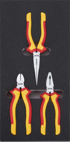 Werkzeugmodul VDE-Zangen, leer• 2-farbige Schaumstoffeinlage, fehlende Werkzeuge auf einen Blick erkennen Zur Aufnahme von: 1 VDE-Kombizange 160 mm 1 VDE-Seitenschneider 160 mm 1 VDE-Storchschna