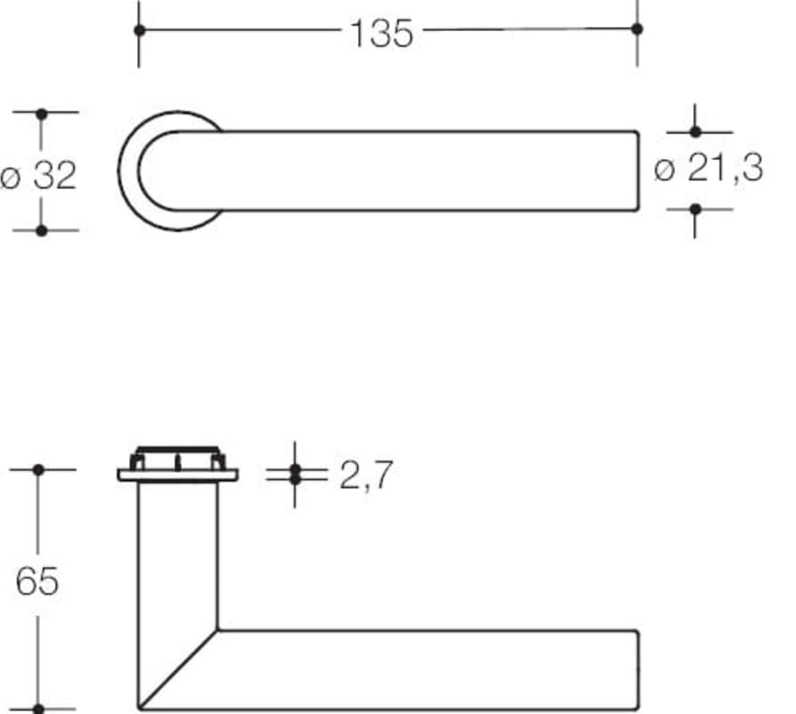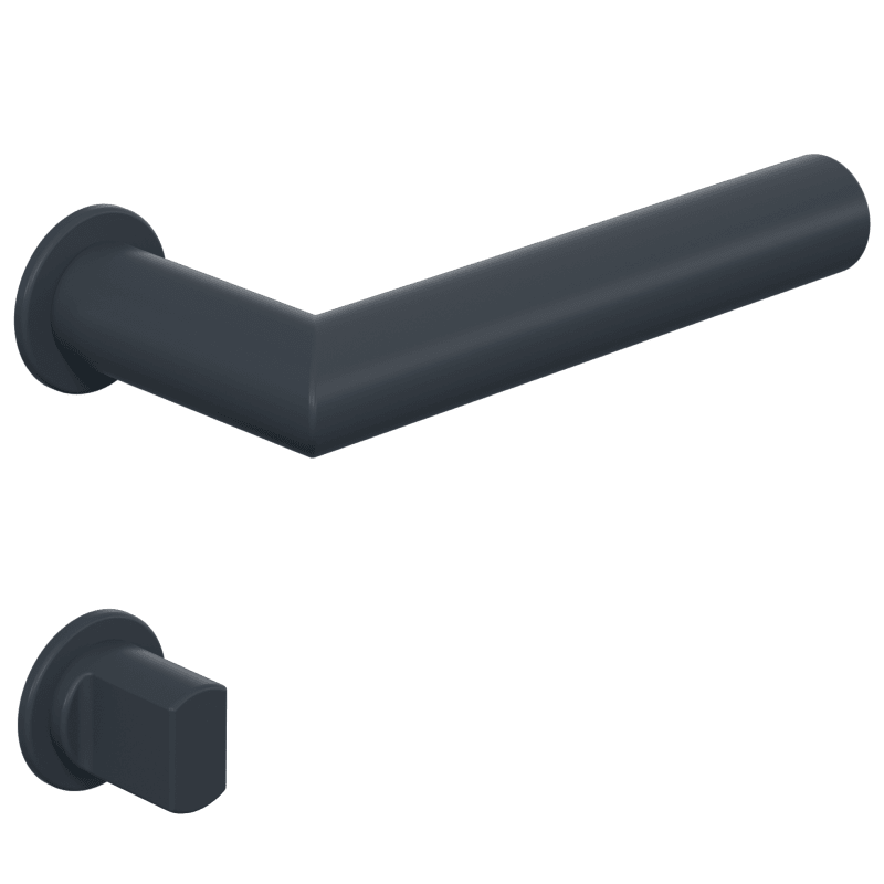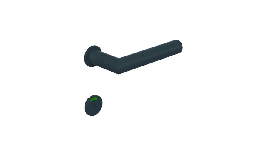 Frei-Besetzt-Garnitur mit flacher Drückerrosette, Abdeck-Kappe aus mattem Polyamid, Durchmesser 32 mm, bestehend aus: Türdrücker Modell 162.21PBM in Gehrungsform aus mattem Polyamid mit durchgehende