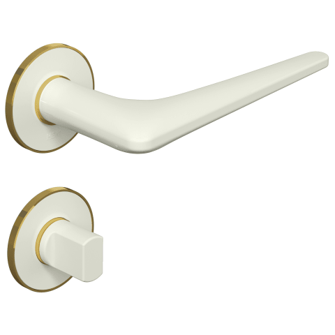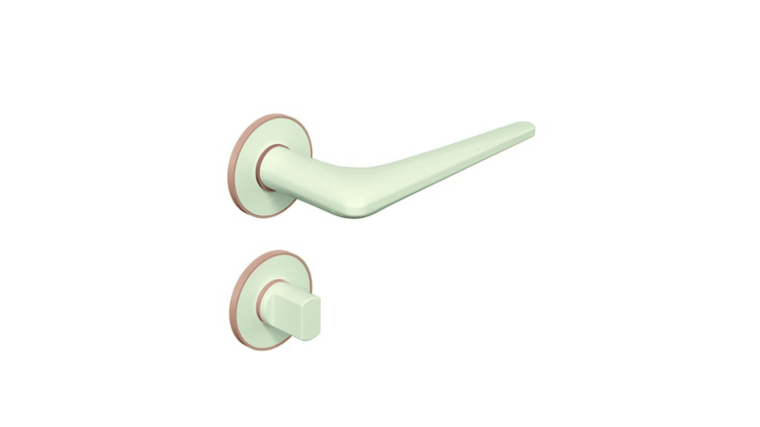 Frei-Besetzt-Garnitur mit flachen Rosetten nach DIN 18255 und DIN EN 1906 und Inlay aus farbigem, mattem Polyamid, bestehend aus: Türdrücker Modell 251.21PB aus mattem Polyamid, durchgängig eingefärb