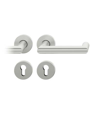FS-AGL3-Drückergarnitur links, 9mm PZ Rundrosette, max. 35°. TS 39-48mm, Aluminium naturfarbig