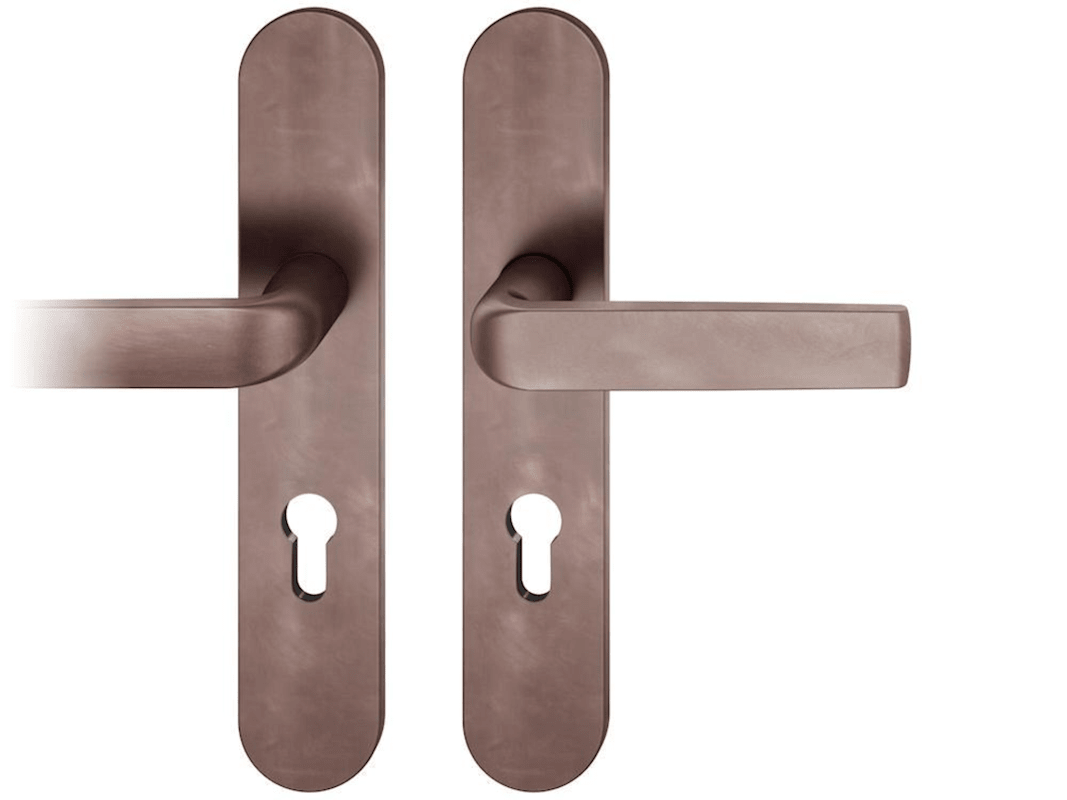 FSB Drückergarnitur 76 1267; Produkttyp: Drückergarnitur; Produkttyp (Hersteller): Drückergarnitur; Ausführung: Langschild; Befestigungsart: verdeckt verschraubt; Befestigungstechnik: mit Stütznocken; Form: oval; Vierkant: 9 mm; Material: Bronze; Material Unterkonstruktion: Kunststoff-Edelstahl verstärkt; Form Türgriff (innen): Design; Form Türgriff (außen): Design; Breite Türgriff (innen): 23 mm; Breite Türgriff (außen): 23 mm; Länge Türgriff (innen): 135 mm; Länge Türgriff (außen): 135 mm; Höhe Türgriff (innen): 53 mm; Höhe Türgriff (außen): 53 mm; Schildbreite außen: 45 mm; Schildbreite innen: 45 mm; Schildlänge außen: 245 mm; Schildlänge innen: 245 mm; Schildstärke außen: 7 mm; Schildstärke innen: 7 mm; Lagerung: mit Rückholfeder,festdrehbar,Ausgleichslager® 3; Einsatzbereich: Objekttür; Türart: Vollblatt; Türwerkstoff: Holz,Stahl; Norm: DIN EN 1906,DIN 18273; Zulassung: für Rauchschutz,für Feuerschutz; Lochung: Profilzylinder gelocht; Entfernung: 72 mm; DIN-Richtung: DIN Rechts; Farbe: braun; Farbton: dunkelbronze; Oberfläche: patiniert gewachst; Design Türdrücker: Hartmut Weise; Betätigungswinkel max.: 35 °; Türstärke min.: 39 mm; Türstärke max.: 48 mm