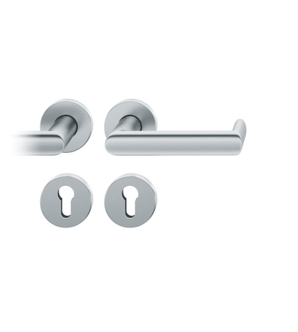 FS-AGL3-Drückergarnitur rechts, 9mm PZ Rundrosette, max. 35°. TS 39-48mm, Edelstahl fein matt
