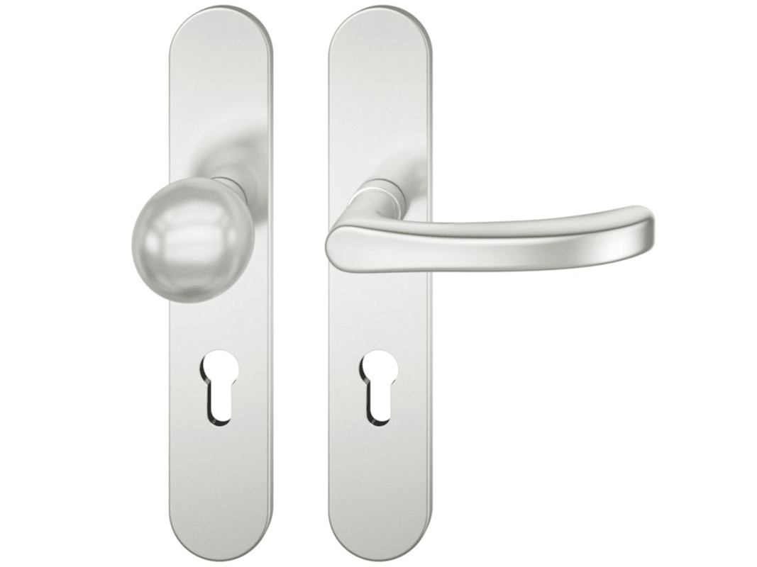 FSB Wechselgarnitur 79 1043; Produkttyp: Wechselgarnitur; Produkttyp (Hersteller): Wechselgarnitur; Ausführung: Langschild; Befestigungsart: verdeckt verschraubt; Befestigungstechnik: mit Stütznocken; Form: oval; Vierkant: 9 mm; Material: Aluminium; Form Türgriff (innen): gebogen; Form Türgriff (außen): Kugelknopf; Gewinde Knopf/Griffplatte: M12; Durchmesser Türgriff (außen): 50 mm; Länge Türgriff (innen): 136 mm; Höhe Türgriff (innen): 63 mm; Höhe Türgriff (außen): 66 mm; Schildbreite außen: 45 mm; Schildbreite innen: 45 mm; Schildlänge außen: 245 mm; Schildlänge innen: 245 mm; Schildstärke außen: 7 mm; Schildstärke innen: 7 mm; Lagerung: mit Rückholfeder,festdrehbar,Ausgleichslager® 3; Einsatzbereich: Objekttür; Türart: Vollblatt; Türwerkstoff: Stahl,Holz; Norm: DIN EN 1906,DIN EN 179,DIN 18273; Zulassung: für Rauchschutz,für Feuerschutz,für Fluchttüren; Lochung: Profilzylinder gelocht; Entfernung: 72 mm; DIN-Richtung: DIN Rechts; Farbe: silber; Farbton: naturfarben; Oberfläche: eloxiert; Design Türdrücker: Christoph Mäckler; Ausführung Vierkant: Rollenwechselstift; Betätigungswinkel max.: 35 °; Türstärke min.: 39 mm; Türstärke max.: 48 mm