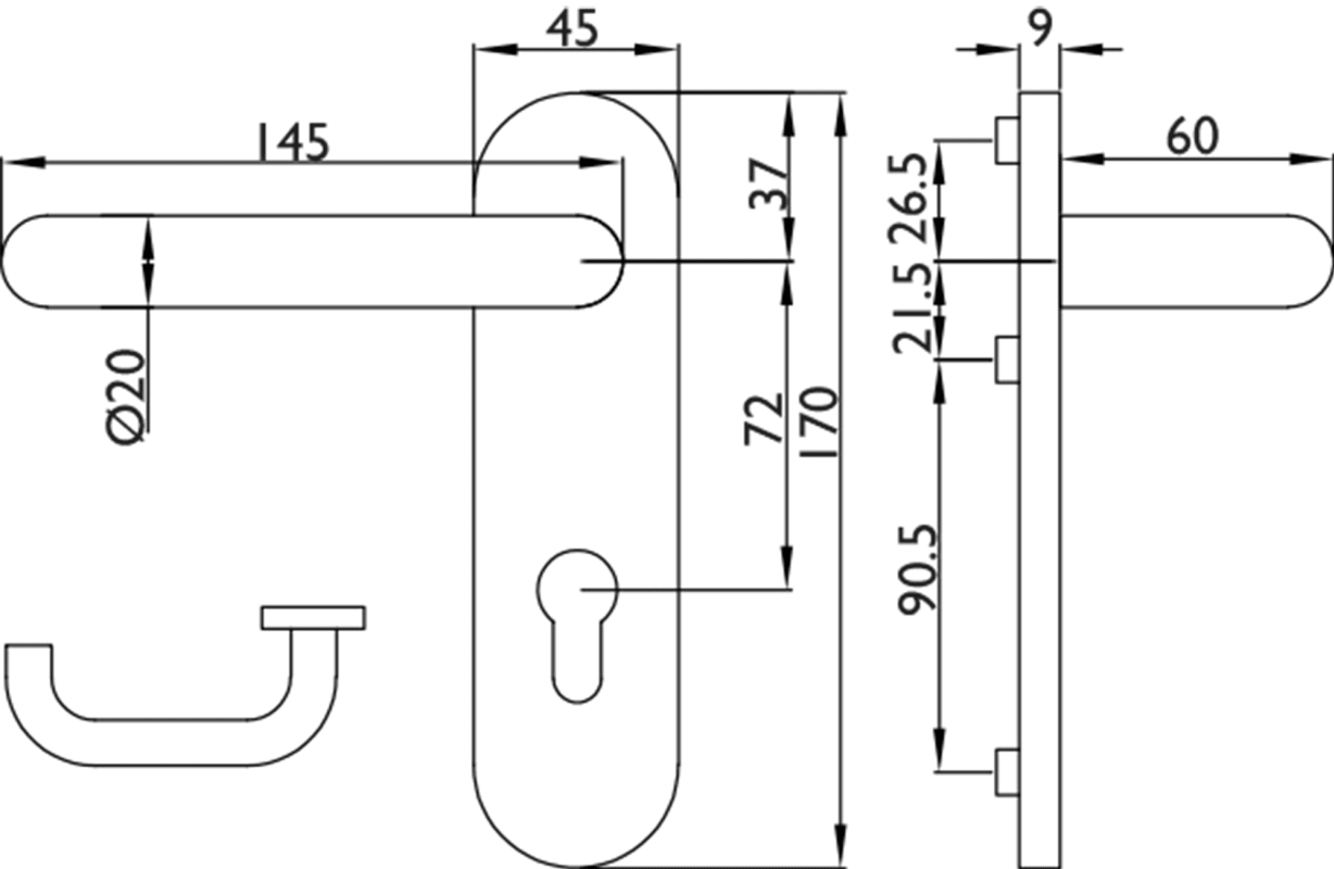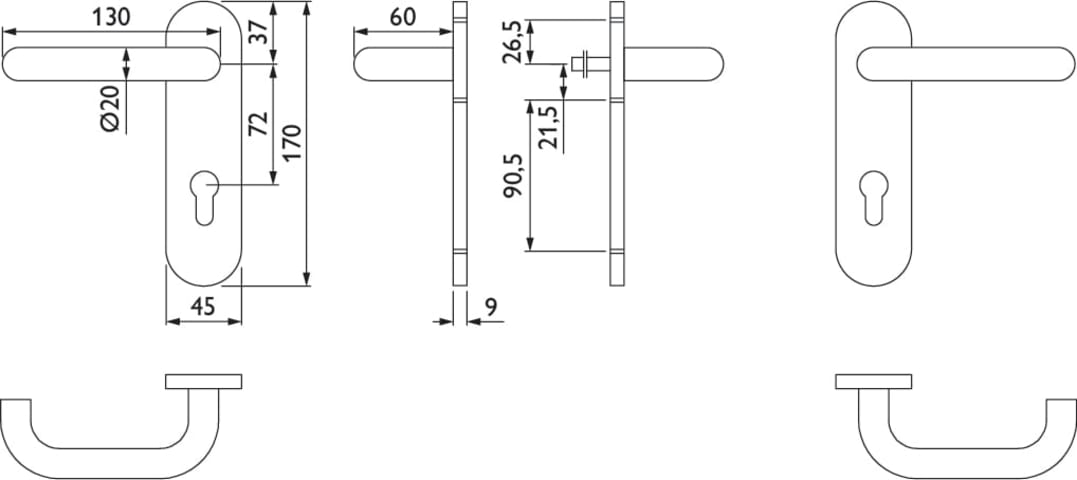Inkl. Befestigungsmaterial, passend für Türstärke: PZ = 45 - 85 mm, PZW = 37 - 63 mm, 9 mm Vierkantstift, Zubehör - Set für abweichende Türstärken auf Anfrage