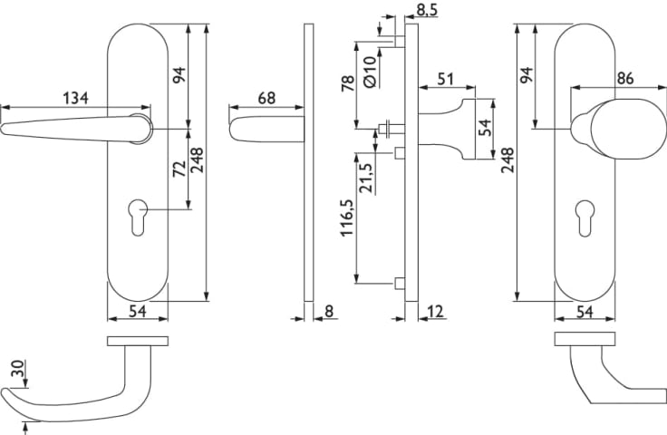 FS-EN2-Schutz-Wechselgarnitur 1806 BASIC 06, mit Langschild 2089 S, Knopf 3128 gekröpft, Ausf.: PZW 72 mm, Türstärke 38 - 63 mm, mit Anbohrschutz, Außenschildstärke 12 mm, Oberfl. 60 (Edelstahl matt)