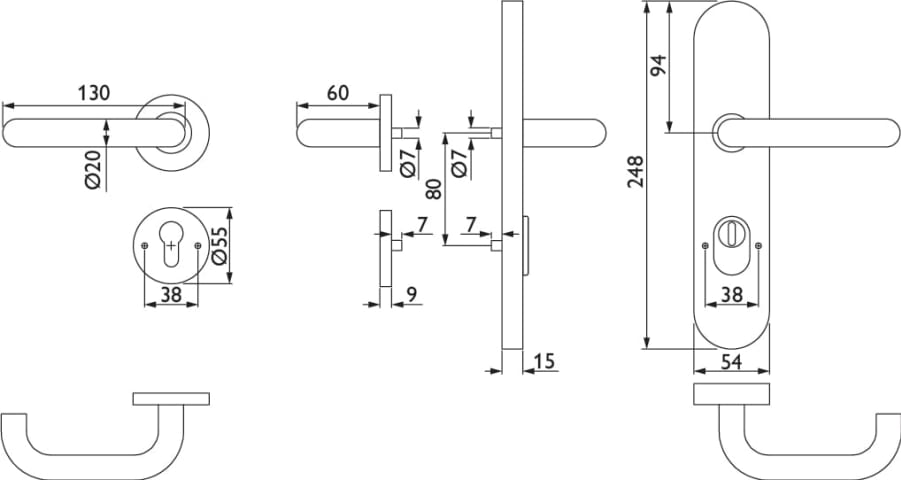 FS-Kombi-Schutz-Drückergrt. 1801 BASIC 01 - EN2, außen Langschild 2089 KS, mit Außendrücker 1802, innen Rosette 2063 FH, PZ 72 mm, Tst. 40 - 58 mm, mit Kernziehschutz für Zylinderüberstand 8 - 15 mm, Oberfl. 60 (Edelstahl matt)