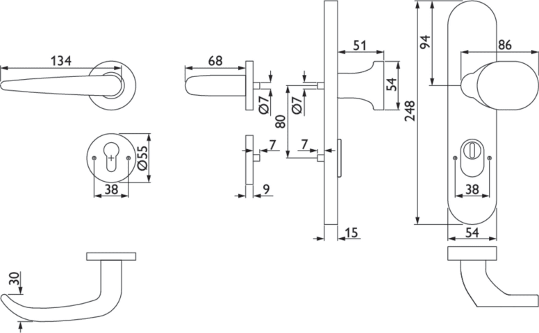 FS-Kombi-Schutz-Wechselgrt. 1806 BASIC 06 - EN2, außen Langschild 2089 KS, Knopf 3128 gekröpft, innen Rosette 2063 FH, PZW 72 mm, Tst. 40 - 58 mm, mit Kernziehschutz für Zylinderüberstand 8 - 15 mm, O