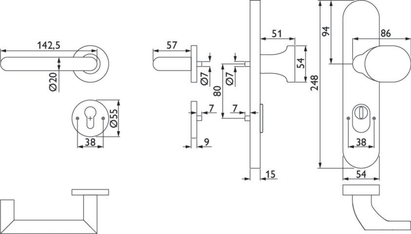 FS-Kombi-Schutz-Wechselgrt. 1808 BASIC 08 - EN2, außen Langschild 2089 KS, Knopf 3128 gekröpft, innen Rosette 2063 FH, PZW 72 mm, Tst. 40 - 58 mm, mit Kernziehschutz für Zylinderüberstand 8 - 15 mm, O