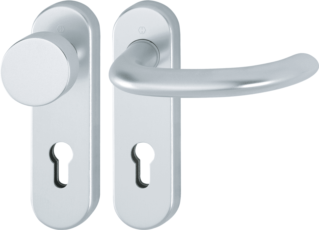 Aluminium-Feuerschutz-Kurzschild-Wechsel-Garnitur für Wohnungsabschluss-Türen Marseille. • Lagerung: außen Knopf fest, innen Türgriff fest/drehbar, Rückholfeder, HOPPE-Steckgriff-Verbindung mit Kugel