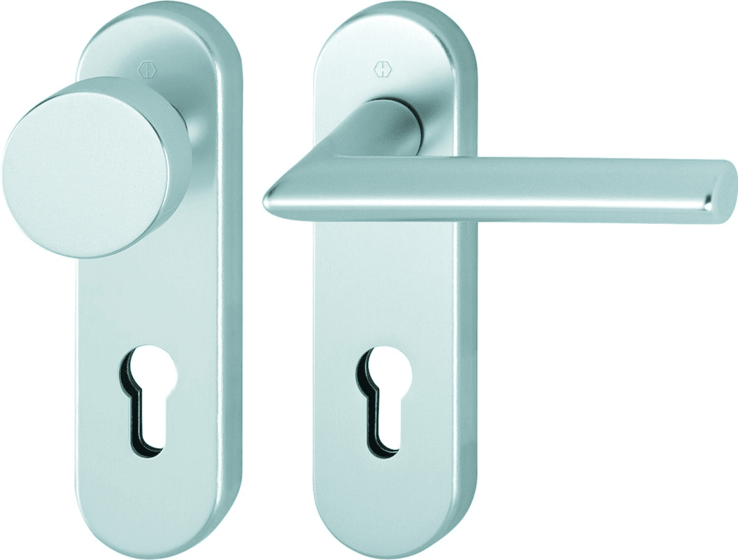 Aluminium-Feuerschutz-Kurzschild-Wechsel-Garnitur für Wohnungsabschluss-Türen Stockholm. • Lagerung: außen Knopf fest, innen Türgriff fest/drehbar, Rückholfeder, HOPPE-Steckgriff-Verbindung mit Kugel