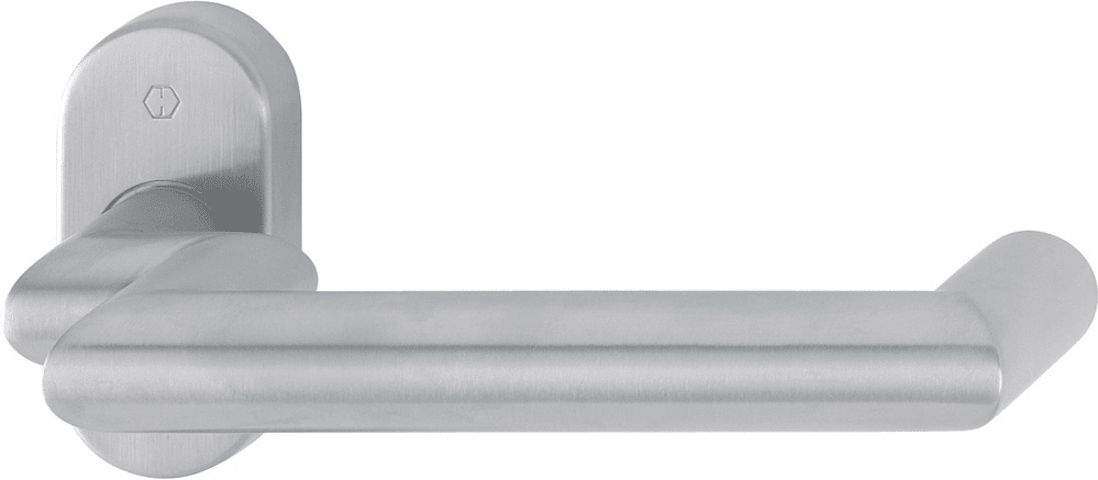 Edelstahl-Feuerschutz-Profiltür-Rosetten-Halbgarnitur: geprüft nach DIN 18273, Türgriff fest/drehbar gelagert in der Metall-Unterkonstruktion, mit Rückholfeder, für HOPPE-Profilvollstift-Verbindung mit Klemmfeder zum Toleranzausgleich in der Schlossnuss, Schlüsselrosette mit Zink-Druckguss-Unterkonstruktion, verdeckte Verschraubung mittels Blindsteckmuttern. Hinweis: Die Schlüsselrosette muss separat bestellt werden!