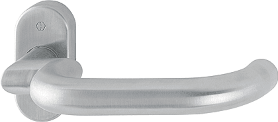 Edelstahl-Feuerschutz-Profiltür-Rosetten-Halbgarnitur: geprüft nach DIN 18273, Türgriff fest/drehbar gelagert in der Metall-Unterkonstruktion, mit Rückholfeder, für HOPPE-Profilvollstift-Verbindung mit Klemmfeder zum Toleranzausgleich in der Schlossnuss, verdeckte Verschraubung mittels Blindsteckmuttern. FS-AP-Türgriff auf Rosette mit EN179-Zulassung. Hinweis: Die Schlüsselrosette muss separat bestellt werden!