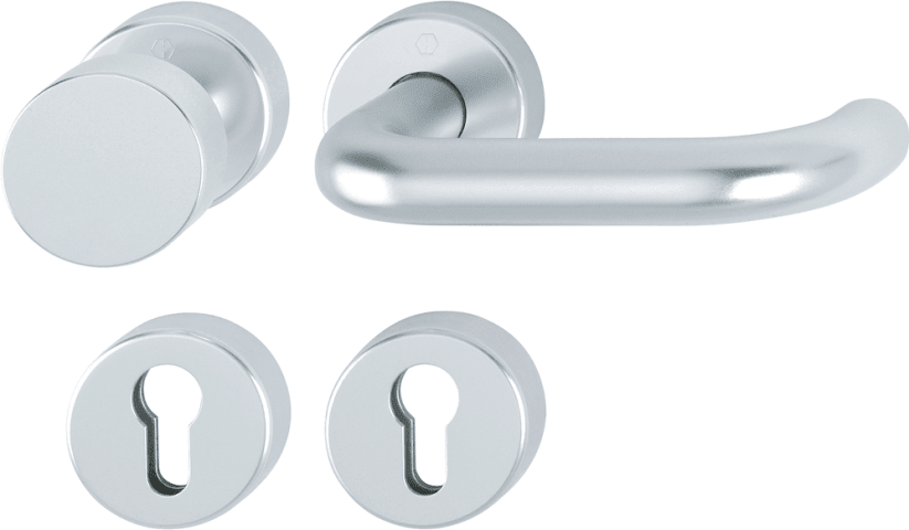 Aluminium-Feuerschutz-Rosetten-Wechsel-Garnitur mit Schlüsselrosetten für Innentüren Paris. • Lagerung: Knopf fest, Türgriff fest/drehbar, Rückholfeder, HOPPE-Steckgriff-Verbindung mit Kugel-Arretieru