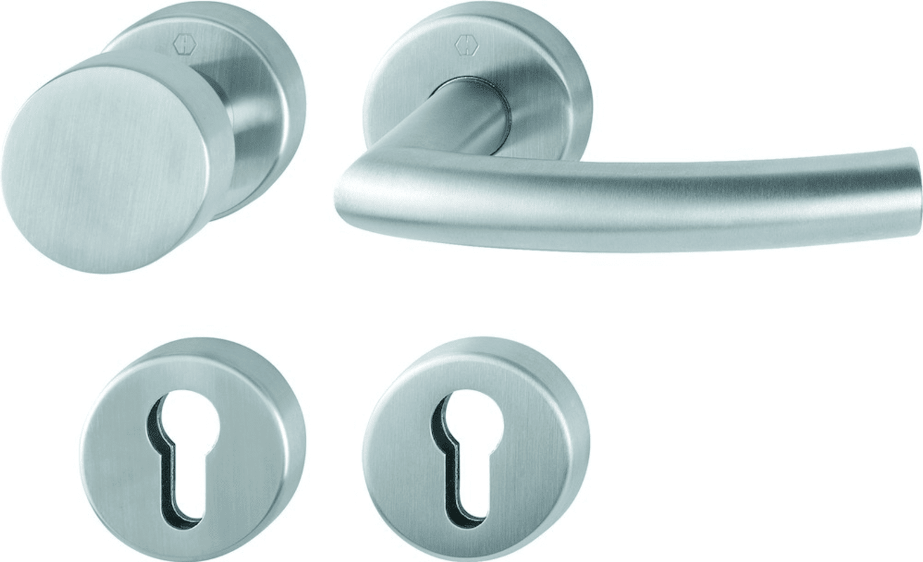 Edelstahl-Feuerschutz-Rosetten-Wechsel-Garnitur mit Schlüsselrosetten für Innentüren Trondheim. • Lagerung: Knopf fest, Türgriff fest/drehbar, Rückholfeder, HOPPE-Steckgriff-Verbindung mit Kugel-Arret