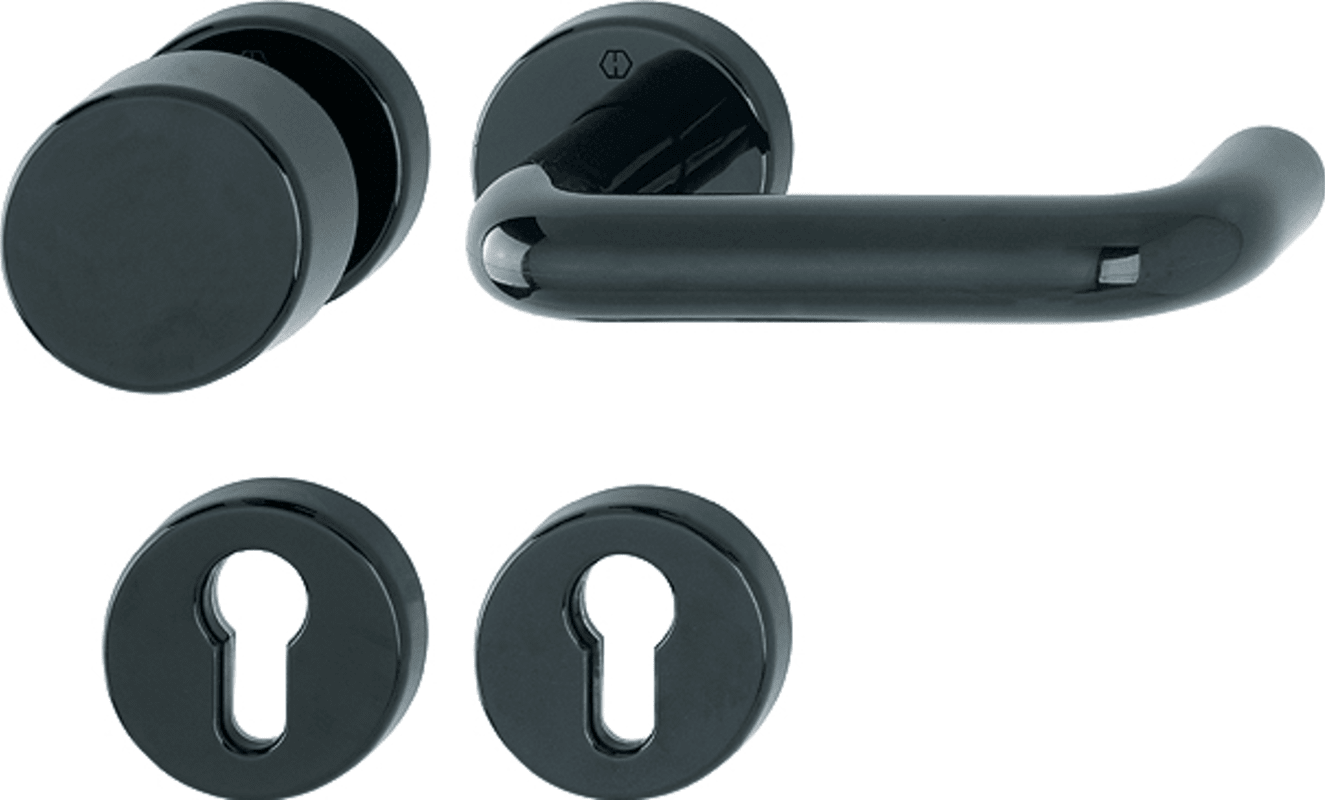Kunststoff-Feuerschutz-Rosetten-Garnituren: geprüft nach DIN 18273, Türgriff mit Stahlkern fest/drehbar gelagert im wartungsfreien Gleitlager der Stahl-Unterkonstruktion, Hoppe-Vollstift-Verbindung, a