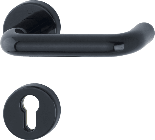 Kunststoff-Feuerschutz-Rosetten-Garnituren: geprüft nach DIN 18273, Türgriff mit Stahlkern fest/drehbar gelagert im wartungsfreien Gleitlager der Stahl-Unterkonstruktion, Hoppe-Vollstift-Verbindung, a