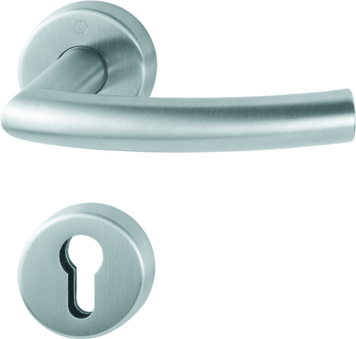 HOPPE® Drückergarnitur Trondheim FS-E1430/42H/42HS; Abdeckung: mit Rosetten; Form: rund; Vierkant: 9 mm; Material: Edelstahl; Befestigungsart: verdeckt verschraubt; Befestigungstechnik: mit Stütznocken; Basis: Drückergarnitur; Lochung: Profilzylinder gelocht; Farbton: edelstahl matt; Anschlagrichtung: Drücker rechts/links verwendbar; Türstärke min.: 40 mm; Türstärke max.: 65 mm; Stärke Abdeckung: 10 mm; Durchmesser: 52 mm; Lagerung: Gleitlager,wartungsfrei,festdrehbar,Rückholfeder,Sertos®; Norm: DIN 18273,DIN EN 1906; Zulassung: für Feuerschutz,für Rauchschutz; Drückerform: gebogen,Gehrung; Drückerdurchmesser: 20 mm; Drückerhöhe: 69 mm; Drückerlänge: 137 mm; Material Unterkonstruktion: Stahl; Drückerbefestigung: Profilvollstift; Befestigungssystem: Steckverbindung; Türart: Innentüren; Türwerkstoff: Holz,Stahl; Einsatzbereich: Feuerhemmend; DIN-Richtung: DIN Links-Rechts