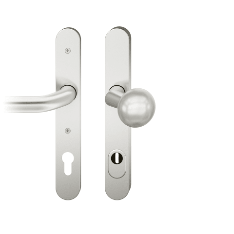 Wechselgarnitur für Feuerschutz-Rahmentüren, Türdrücker mit festdrehbarer Lagerung, Außenschild 14 mm, Innenschild 7 mm.