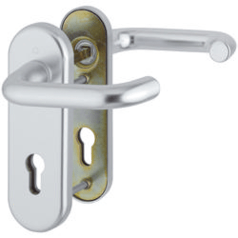 Aluminium-Feuerschutz-Schutzbeschlag (Drücker-Garnitur) ES1 (SK2): geprüft nach DIN 18257, DIN 18273, Stahl-Unterkonstruktion im Außen- und Innenschild; außen: Türgriff fest/drehbar gelagert; innen: T