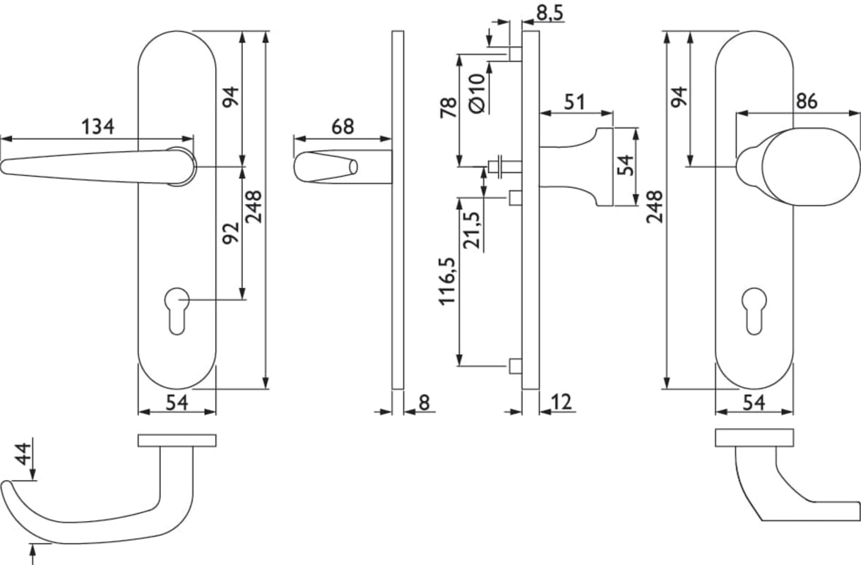 FSAP-EN2-Schutz-Wechselgarnitur 1816 BASIC 16, mit Langschild 2089 S, Knopf 3128 gekröpft, Ausf.: PZW 92 mm, Türstärke 38 - 63 mm, mit Anbohrschutz, Außenschildstärke 12 mm, Oberfl. 60 (Edelstahl matt)