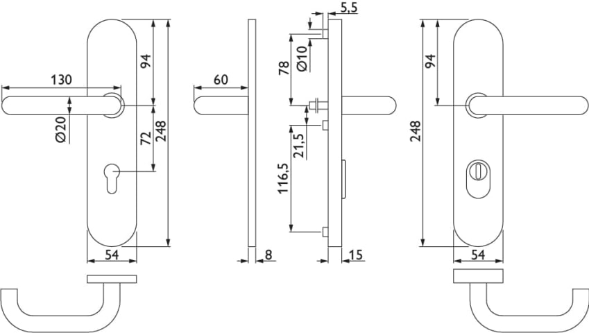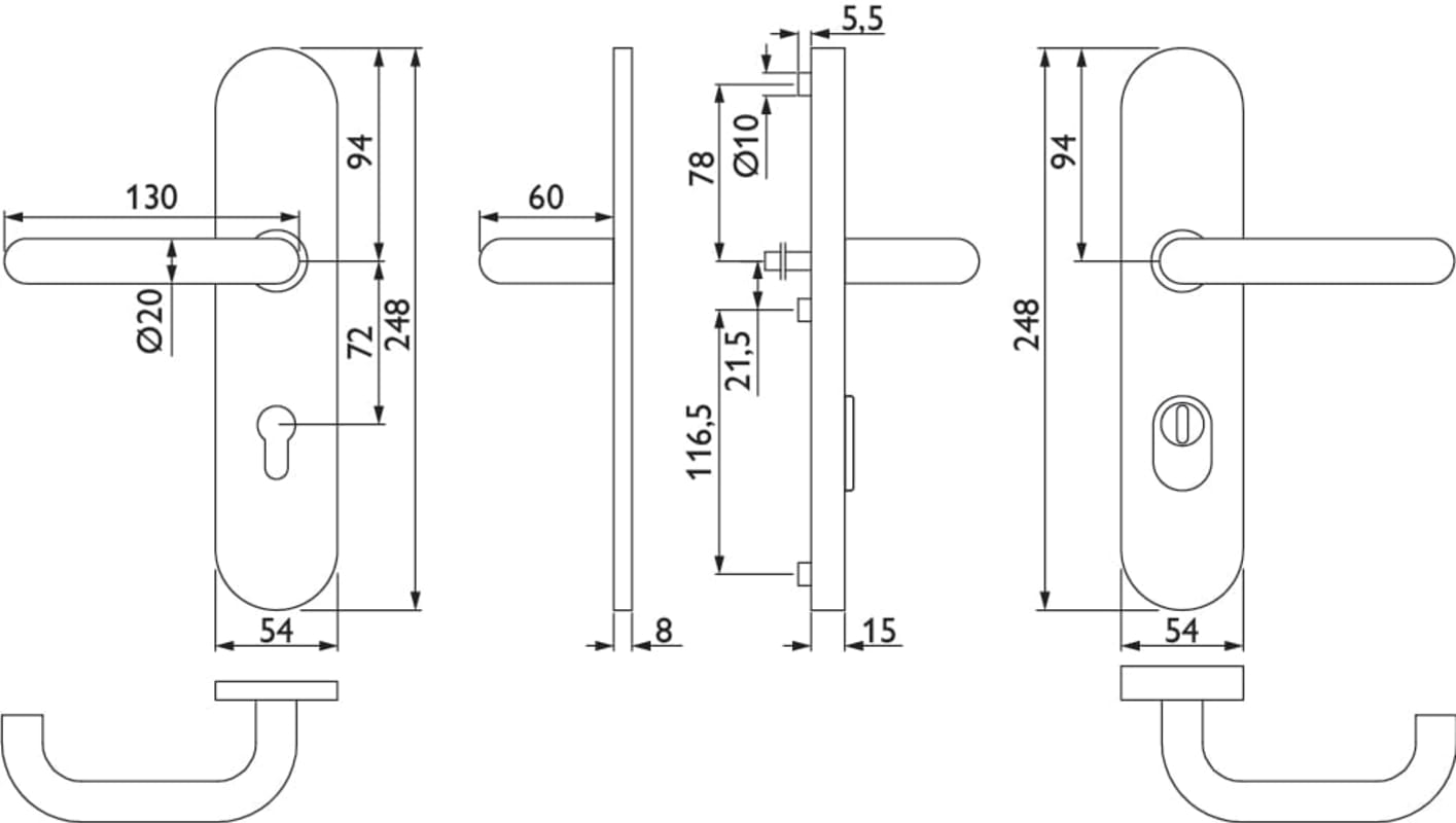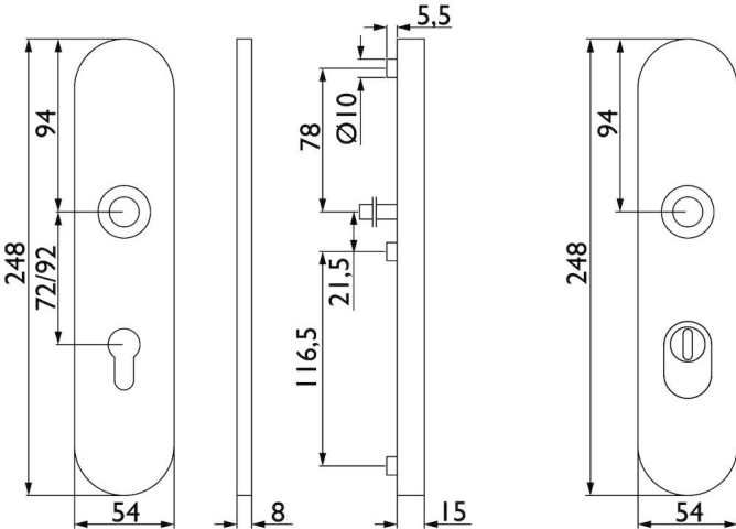 FSAP-Schutz-Drückergarnitur 1801 BASIC 01, mit Langschild 2089 KS, Stift geteilt a53/i59, Ausf.: PZ 72 mm, Türstärke 38 - 48 mm, mit Kernziehschutz für Zylinderüberstand 8 - 15 mm, Oberfl. 60 (Edelsta