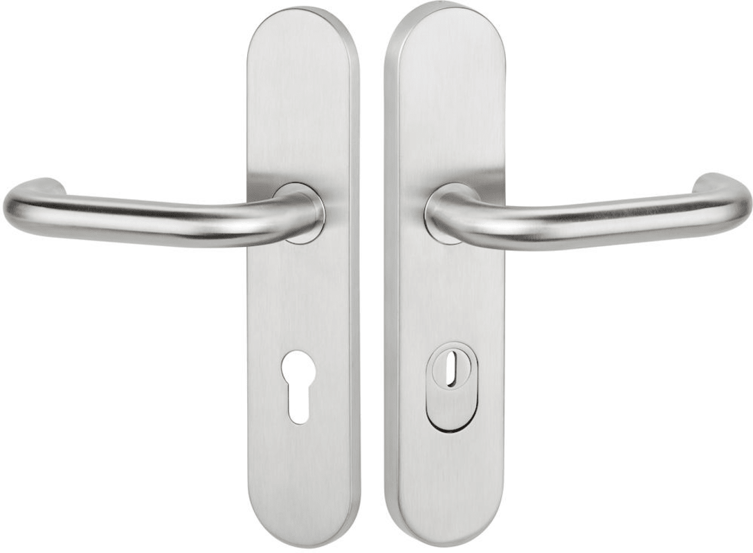 FSAP-Schutz-Drückergarnitur 1801 BASIC 01, mit Langschild 2089 KS, Stift geteilt a53/i59, Ausf.: PZ 72 mm, Türstärke 38 - 48 mm, mit Kernziehschutz für Zylinderüberstand 8 - 15 mm, Oberfl. 60 (Edelstahl matt)