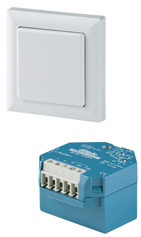 Funktaster-Set mit Empfänger Taster: 80 x 80 mm mit Wippe einteilig inkl. 2000 mm Kabel für Livorno mit Laufschiene 2000 mm Taster: Reinweiß/ Empfänger: Blau