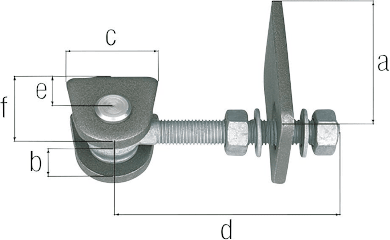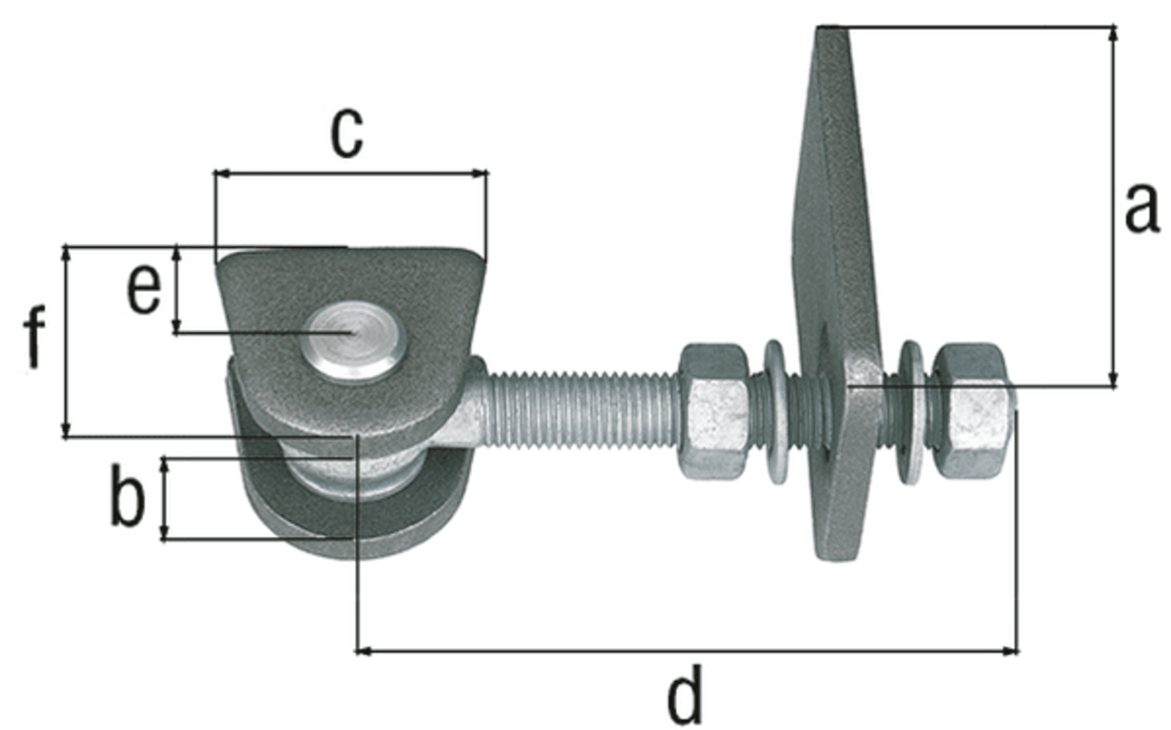 Verstellbares Torband• Für 180°-Öffnung • Breite verstellbar • Anschweißteile: Stahl roh, Bolzen und Splint: Edelstahl, Schrauben und Muttern: feuerverzinkt • Je ein Anschweißstück für Pfosten und