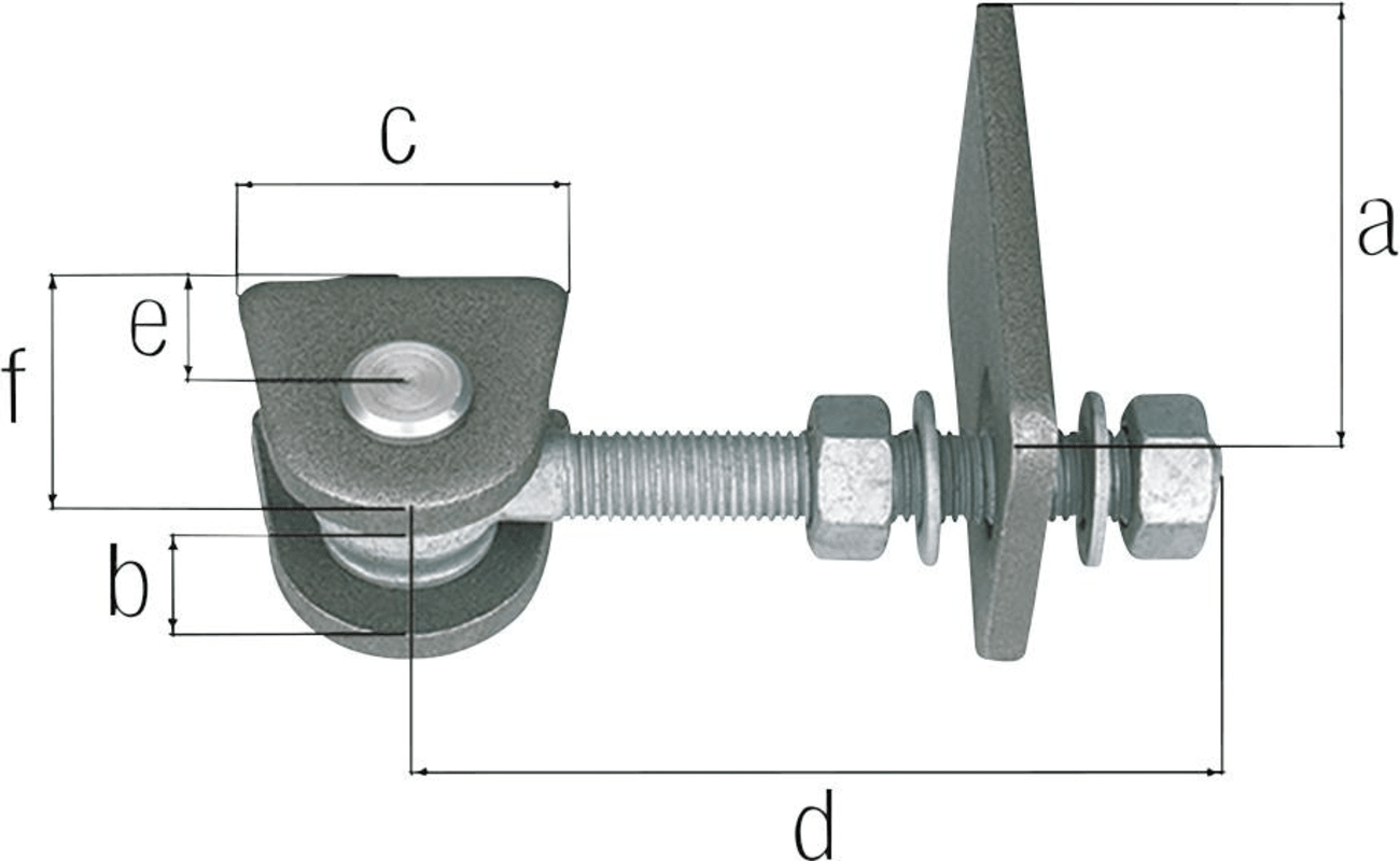 GAH Alberts Torband verstellbar; Ausführung: 2-fach verstellbar; Befestigungsart: zum Anschweißen; Basis: Torband verstellbar; Gewinde: M12; Material: Stahl; Oberfläche: roh; Material Verbindungsbolzen: Edelstahl; Oberfläche Augenschraube: feuerverzinkt; Maß F: 45mm; Schraubendurchmesser: 12mm; Maß b: 19mm; Maß a: 135mm; Maß c: 44mm; Maß D: 120mm; Maß E: 25mm