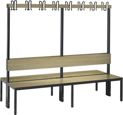 Doppelseitige Garderobenbank, ohne Schuhrost • Stabile 4-kant-Rohr-Konstruktion aus Stahl, 30 x 30 mm • Gestell: elektrolytisch verzinkt, hochwertig einbrennbeschichtet • Sitzfläche, Rückenlehne, Hakenleiste: Vollkernplatte (HPL) 13 mm, mit Dekoroberfläche • Bodengleiter: verstellbar, für einfachen Niveauausgleich, 10 mm • Hakenleiste: mit Kunststoff-Doppelkleiderhaken, verdeckt nach DIN 7917 • Farbe Gestell: RAL 7021 schwarzgrau (andere Beschichtungen auf Anfrage) • Lieferung: vormontiert • Höhe: 1710 mm • Tiefe: 760 mm • Sitzhöhe: 401 mm Hinweis: Alle Basic Plus Gestelle sind elektrolytisch verzinkt und für Feuchträume geeignet.
