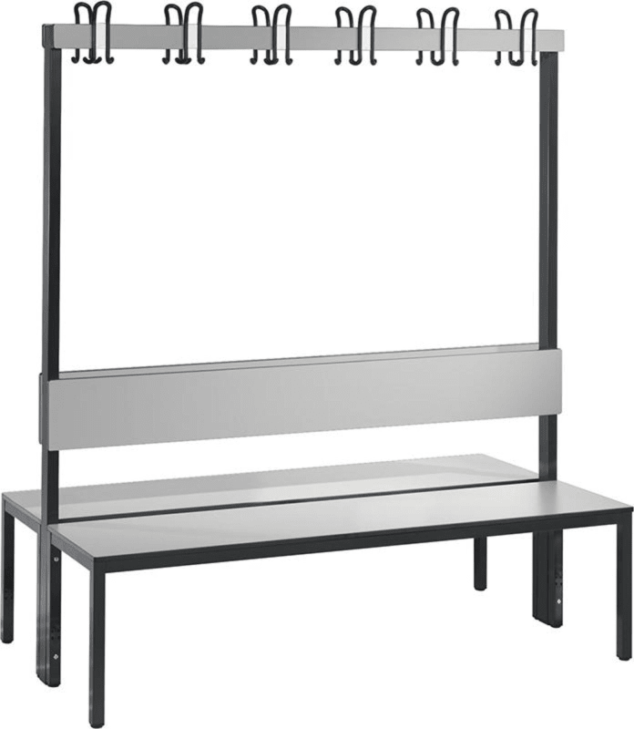Doppelseitige Garderobenbank, ohne Schuhrost • Stabile 4-kant-Rohr-Konstruktion aus Stahl, 30 x 30 mm • Gestell: elektrolytisch verzinkt, hochwertig einbrennbeschichtet • Sitzfläche, Rückenlehne, Hak