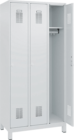 Garderobenschrank, mit Füße • Geeignet für Berufs- und Alltagskleidun • Kunststoff-Füße: Höhe 100 mm, lose, zur Selbstmontag • Abteilbreite: 300 m • Abteilboden: glatt, leicht auskehrba • Ablageboden: mit Garderobenstange und 3 Haken je Abtei • Türen rechts angeschlagen mit Belüftungs-Lochbild und Etikettenrahme • Drehriegelverschluss für Vorhangschloss