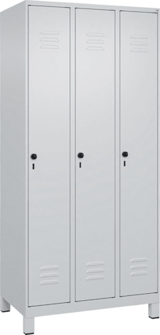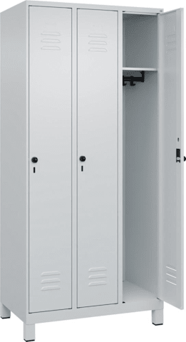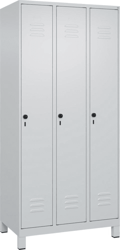 Garderobenschrank Classic PLUS, mit Füße • Stabile Stahlkonstruktio • Mit hochwertiger Einbrennbeschichtun • Mit 100 mm hohen Füßen aus Kunststoff, bei Korpusfarbe RAL 7035 in lichtgrau, sonst schwarzgra • Türen rechts angeschlagen mit Anschlagdämpfer und Lüftungskiemen, mit Sicherheits-Drehriegelverschluss (kein Überdrehen mehr möglich • Bessere Belüftung durch zusätzliche Lüftungsöffnungen im Abtei • Mit Etikettenrahme • Abteilböden glatt, leicht auskehrba • Innen pro Abteil 1 fest verschweißter Ablageboden, darunter stabile Garderobenstange mit 3 verdrehsicheren Doppel-Schiebehake • Fußteil serienmäßig verzinkt für erhöhten Korrosionsschut • Hohe Stabilität durch Materialdoppelung an den entscheidenden Stelle • Schmale Seitenkanten für homogene Optik bei Reihenstellung