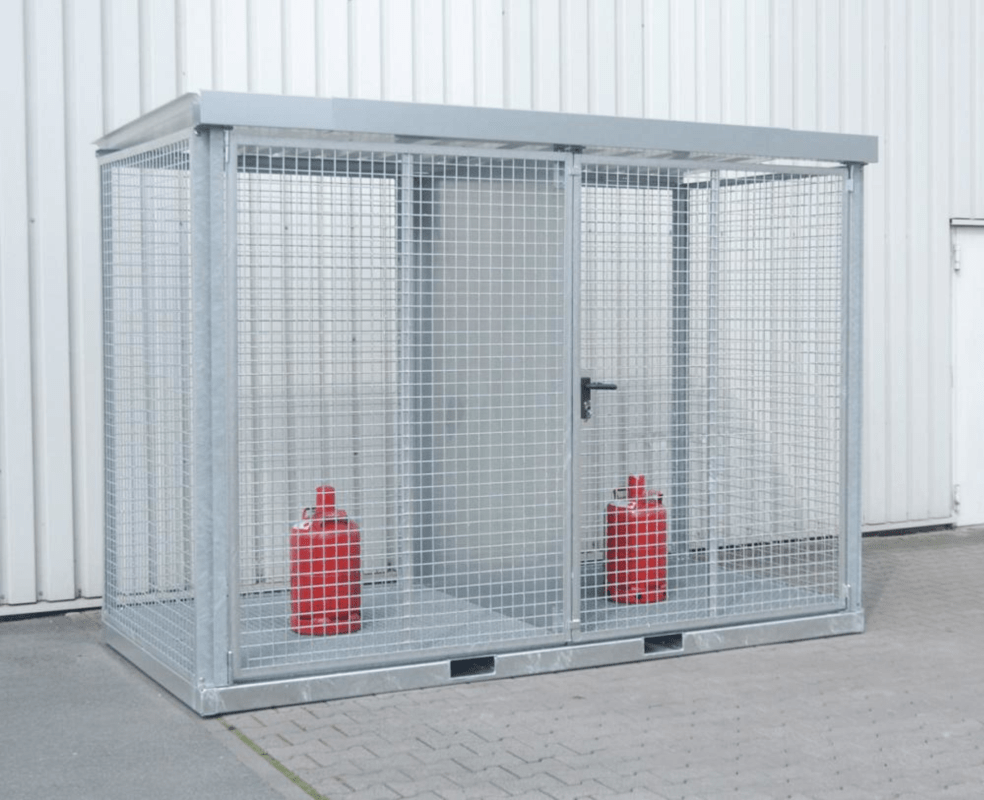 Gasflaschen-Container, mit Gitterrostboden • Stabile Rahmenkonstruktion: mit Dach und Boden • Oberfläche: feuerverzinkt nach EN ISO 1461 • Mit Gitterrostboden: Tragfähigkeit 1000 kg/m² • Flügeltor: abschließbar • Mit Einfahrtaschen: zur Aufnahme mit einem Gabelstapler Lieferung: Komplett montiert. Hinweis: Dieser Container ist geeignet zur Lagerung von Gasflaschen im Außenbereich nach TRGS 51