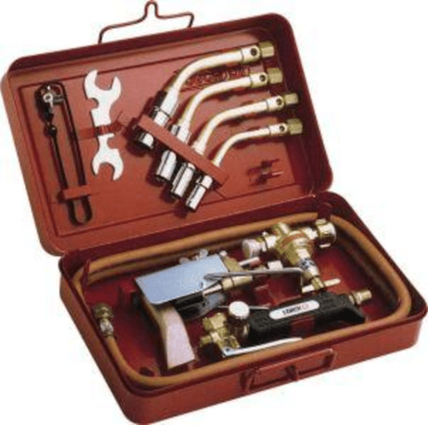 Lieferung: Garnitur bestehend aus Handgriff, Weichlöteinsatz kpl. mit Kupferstück 350 g (Hammerform), gekröpft, 4 Turbobrennern Ø 12/14/17/20 mm, 2-m-HD-Schlauch G 3/8" LH, Regler fest eingestellt (2,0 bar) mit Schlauchbruchsicherung für 5- und 11-kg-Propan-Flaschen, Gasanzünder, Gabelschlüssel, Stahlblechkasten.