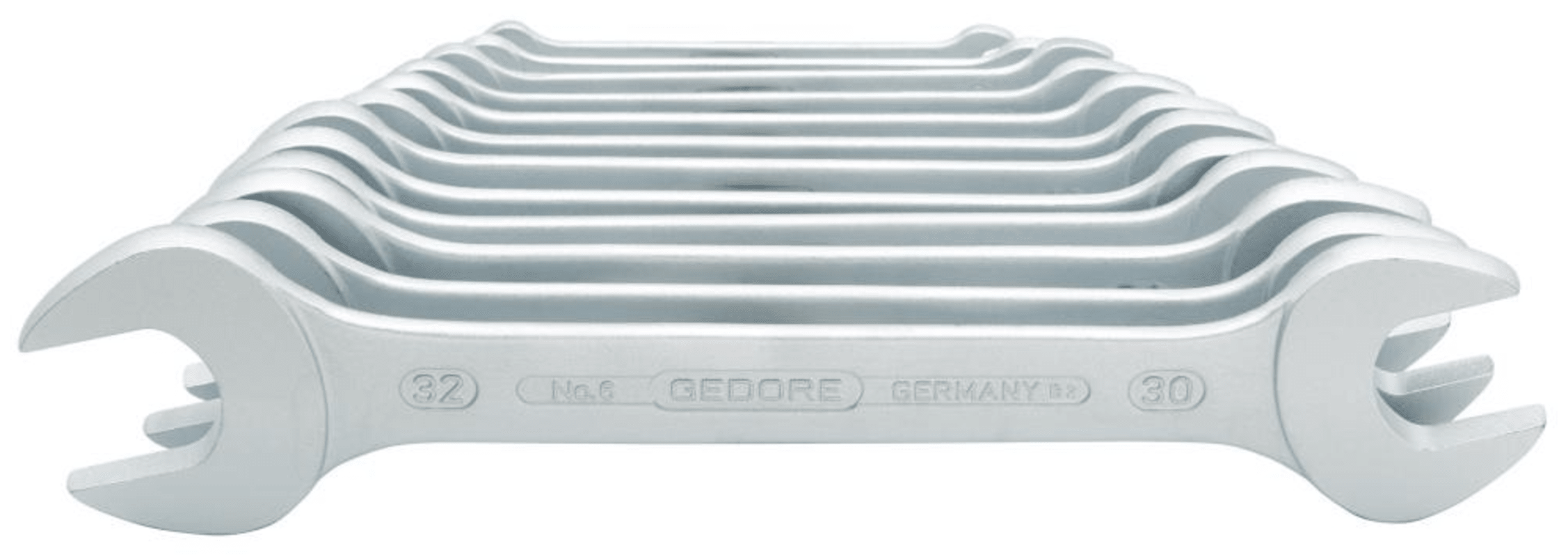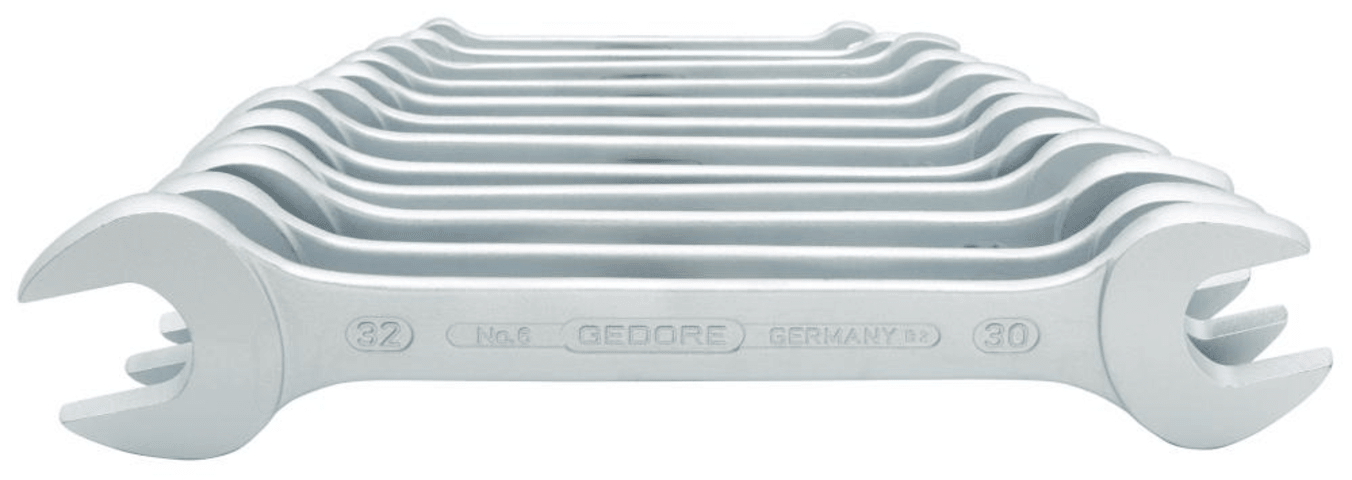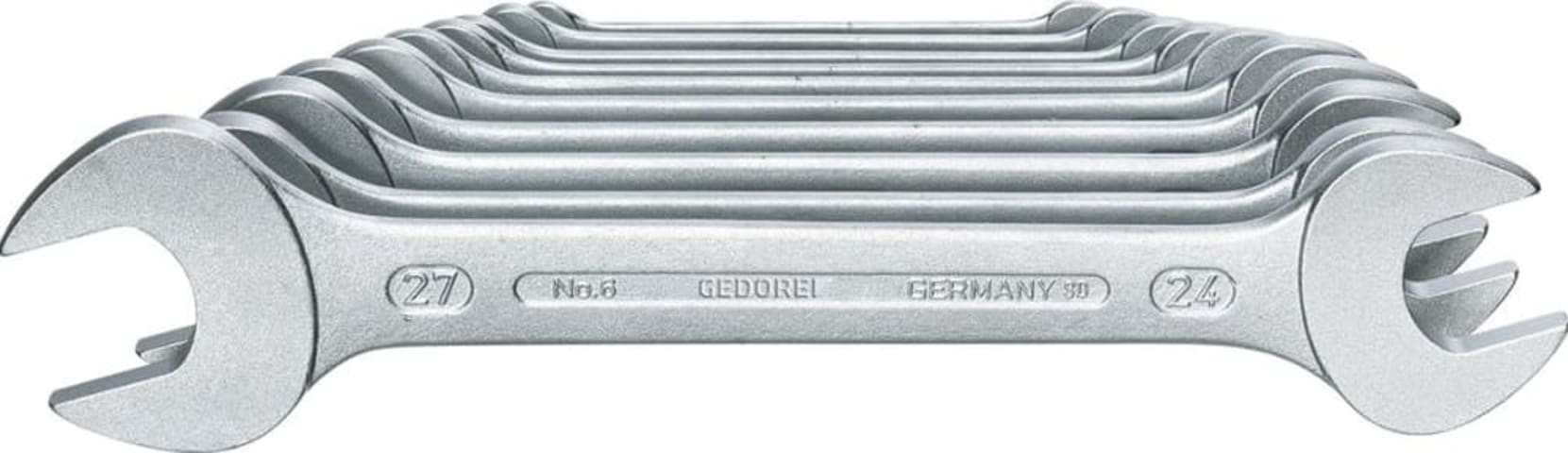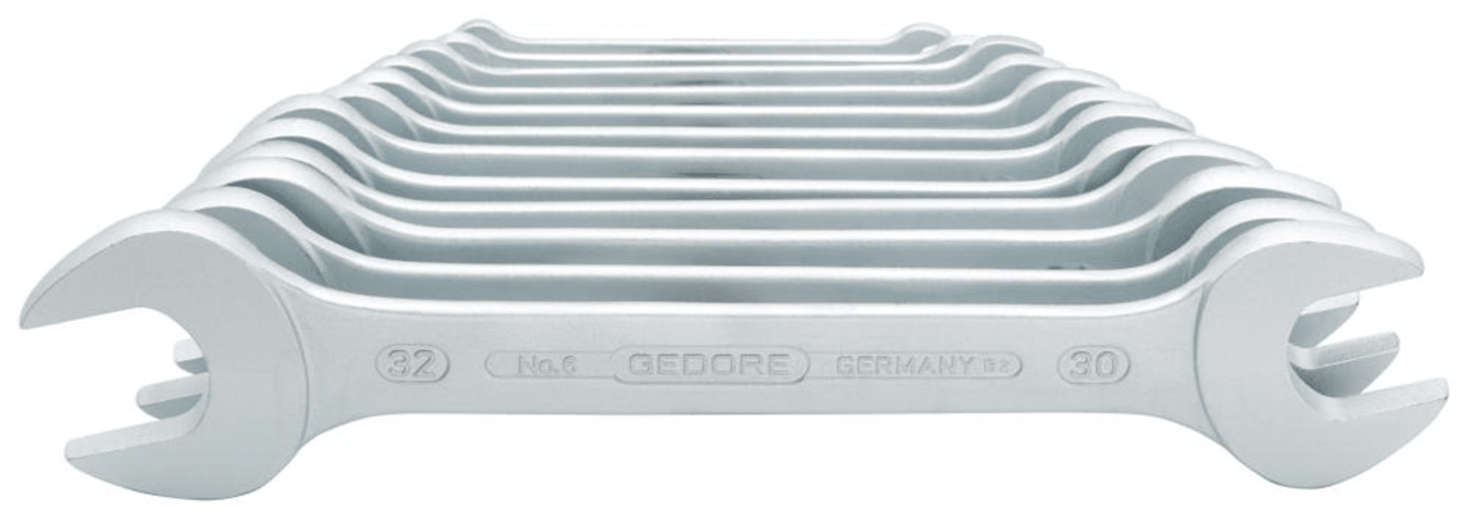 Doppel-Maulschlüssel-Satz, Nr. 6• Matt verchromt • Chrom-Vanadium-Stahl 31CrV3 • Geschmiedet • Maulstellung 15° abgewinkelt • DIN 3110, ISO 3318, ISO 1085, ISO 10102Inhalt:6 x 7, 8 x 9, 10 x 11, 1