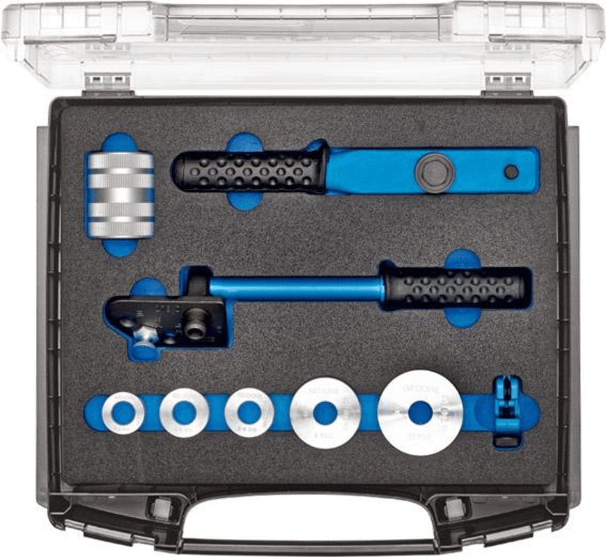 Lieferung: Grundkörper, Biegehebel, 5 Alu-Biegesegmente 3–4; 5; 6; 8; 10 mm, Mini-Rohrabschneider Ø 4–16 m, Rohrfräser Ø 8–35 mm in i-BOXX®.