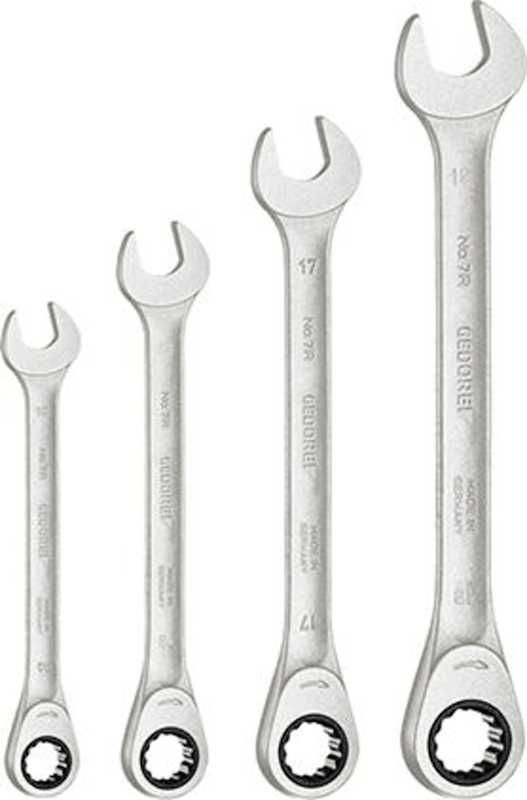Maul-Ringratschen-Schlüssel-Satz, Nr. S 7 R-04• Matt verchromt • Chrom-Vanadium Stahl 31CrV3 • Sperreinsatz und Sperrklinke manganphosphatiert • Ratschenkopf gerade • Maulstellung 15° abgewinkelt