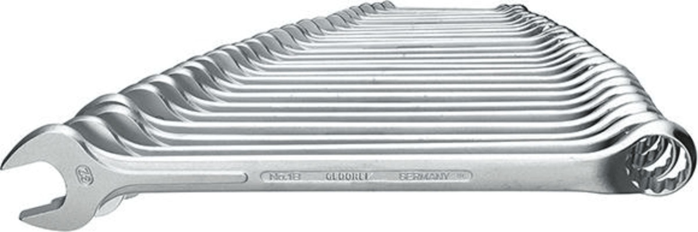 Ring-Maulschlüssel-Satz, Nr. 1 B• Matt verchromt • Chrom-Vanadium-Stahl 31CrV3 • Geschmiedet • Maulstellung 15° abgewinkelt • Ringseite 10° gekröpft • DIN 3113 B, ISO 3318, ISO 7738 • Für tiefli